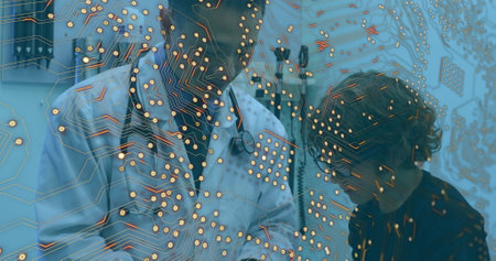 Microprocessor connections against asian male doctor talking to caucasian boy at hospital. Medical healthcare and technology concept