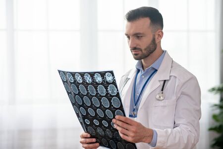 MRI results. Bearded young doctor in a white robe analyzing MRI results
