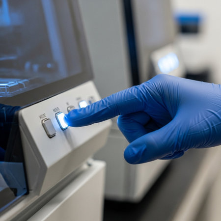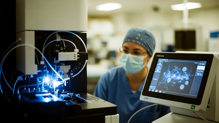 Laboratory technician engages with a sophisticated automated analyzer, performing diagnostic tests in a well-equipped modern lab.