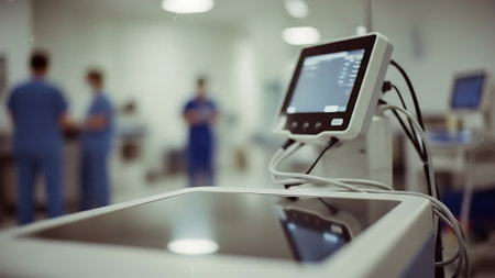 Defibrillator machine displays vital signs, ready to provide life saving treatment in a bustling emergency room setting