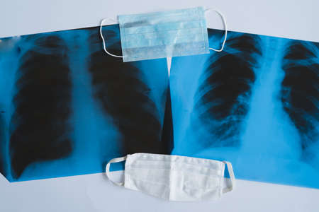 Protective medical masks of two types. Reusable fabric and disposable medical masks. Pandemic Covid-19, quarantine, stay at home, prevention of virus, diseases coronavirus. X-ray images of the lungs.