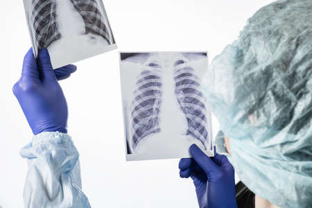 X-ray picture in the hands of a doctor on a white background, a medical worker looks at a picture of an X-ray of the human lungs.