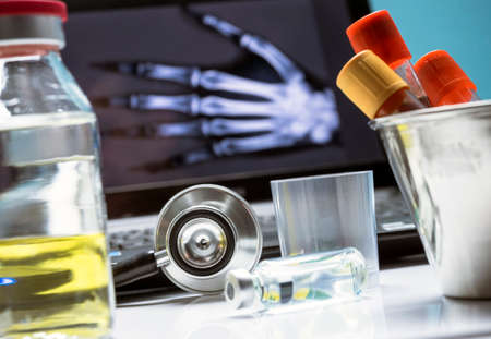 Several vials and blood sample next to stethoscope in a hospital, conceptual image