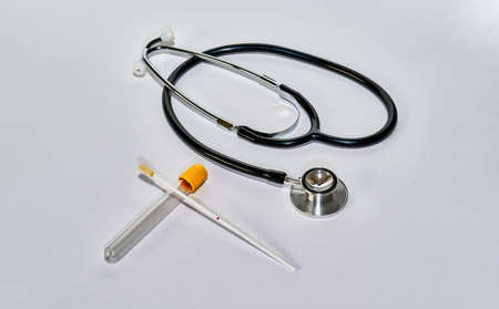 Group of medical objects, consisting of a specimen tube, with its swab and a stethoscope, on a white background.