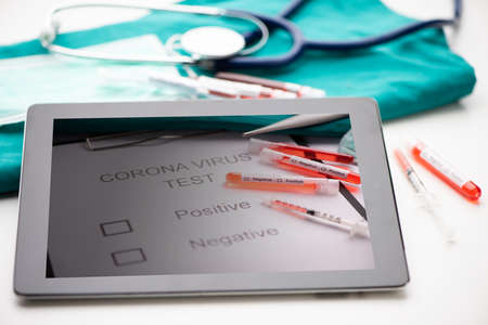 White health center desk with tablet with coronavirus title and medical and office supplies. Close up