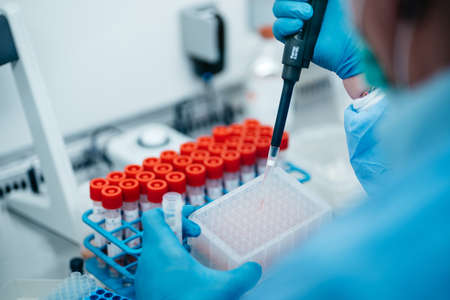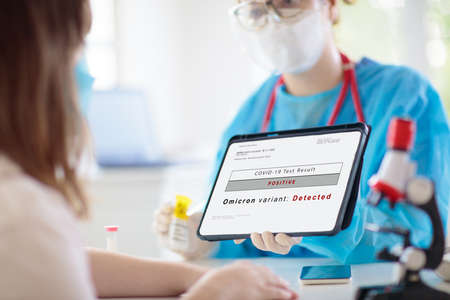 Omicron variant of covid 19 testing. Coronavirus test in hospital laboratory. Doctor analyzing patient blood and nasal swab sample for new covid-19 mutation. Pandemic prevention. Clinical research.