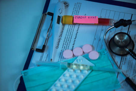 Blood test of the coronavirus surrounded by pills, mask and gloves. The blood tube is labeled positive for 2019-NcOv.