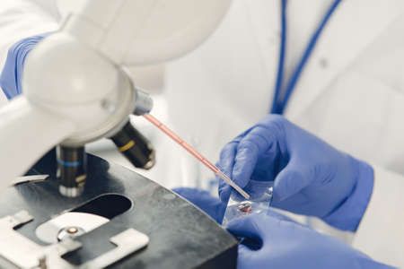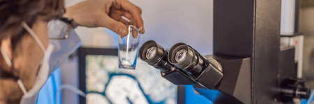 Portrait of caucasian male chemist scientific researcher using microscope in the laboratory interior. coronavirus BANNER, LONG FORMAT