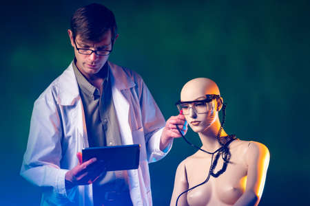 Development of artificial intelligence. The engineer configures the robot. Testing artificial intelligence. Scientist with a tablet. A man next to a cyborg woman. The man puts the wires to the robot.