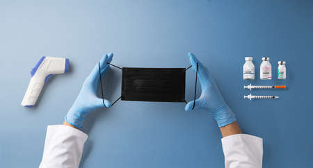 Hand with face mask, syringe injection, covid-19 and vaccination concept.