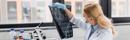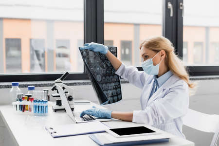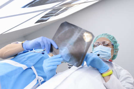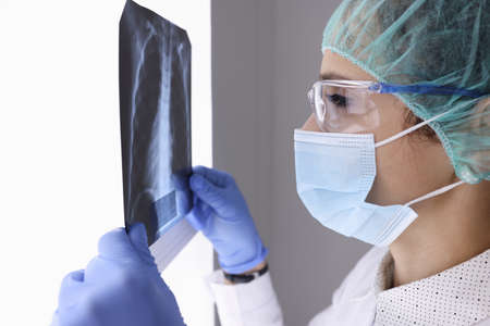 Woman doctor in protective medical mask and glasses looks at an X-ray picture. Medical examination of internal organs concept