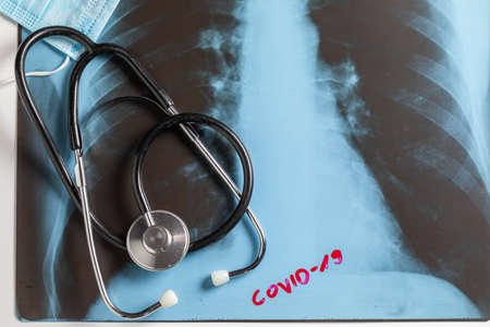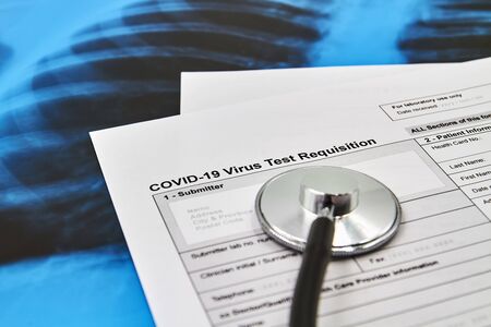 A part of COVID-19 Virus test Requisition form and Stethoscope on the background of lung x-ray. Concept of protection from Coronavirus. Closeup.