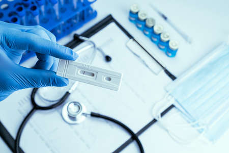 Sars test antigen coronavirus kit. Doctor holding rapid covid medical test. laboratory hospital lab background. Patient fast swab serology antibody specimen sample