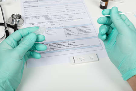 Close up picture of doctors hand holding coronavirus test and medical paperwork on white background