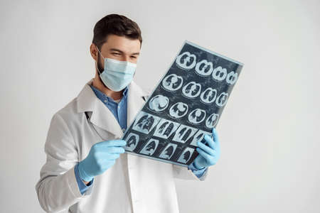 Smiling man doctor in face mask analyzing lungs x-ray MRI scan view good results