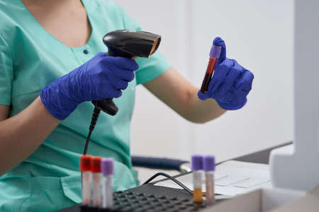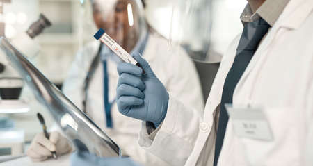 Dealing with another positive case. Closeup shot of an unrecognisable scientist holding a blood filled test tube labelled with a positive Covid-19 test result.
