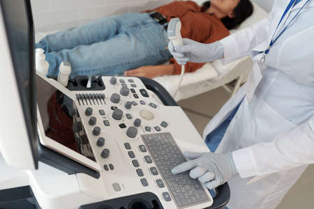 Gloved hand of female clinician pressing button on keypad of ultrasound machine while going to examine young patient on couch
