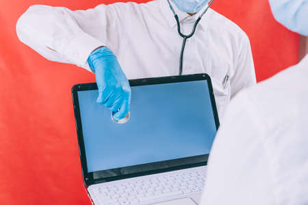 Two doctors with blue gloves in masks on the face with a laptop on a red background
