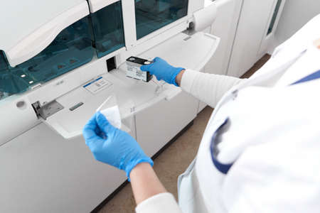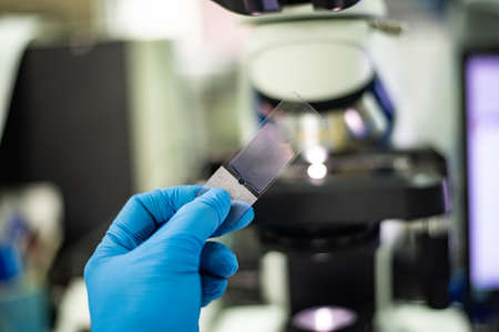 Frankfurt, Germany - July 27, 2017: Scientist with DNA Sequencing Chip. Medical laboratory.