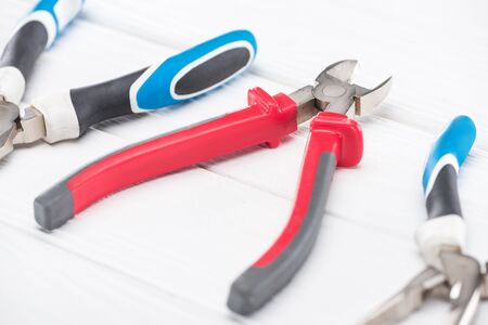Selective focus of pliers on white wooden background