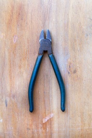 Pliers on a wooden background in a top view