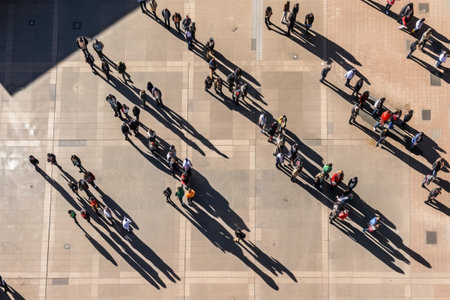 Aerial view of busy crosswalks showcasing the dynamic movement of people in urban settings.