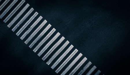 Pedestrian crossing: white strips of paint on black surface of asphalt. Top view shot.