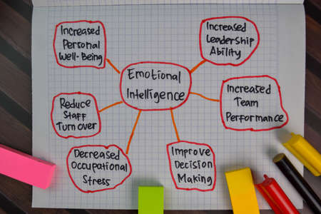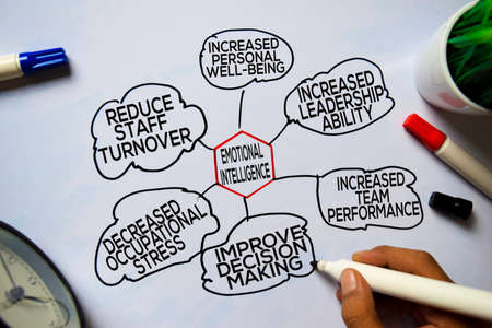Emotional Intelligence text with keywords isolated on white board background. Chart or mechanism concept.