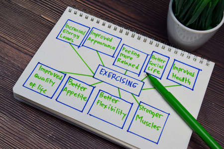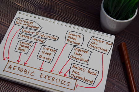 Aerobic Exercise write on a book with keywords isolated wooden table.