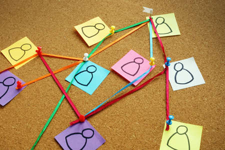 paper card with diagrams, dollar sign and gearwheel drawing pinned on cork office board