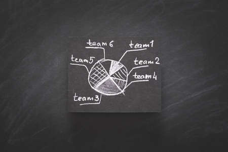 pie graph with segments. teamwork cooperation and labor division and work delegation. diagram on black chalkboard.