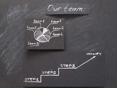 pie graph with segments and steps to earning money. teamwork company strategy. diagram on black chalkboard.
