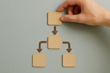 Business process and workflow automation with flowchart. Hand holding wooden cube block arranging processing management on yellow background