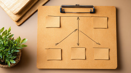 A modern workspace featuring a clipboard adorned with sticky notes, perfect for organizing ideas and planning projects in creative and professional settings.