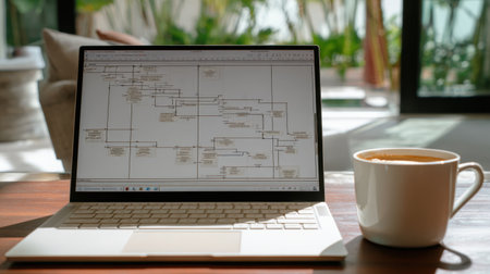 A stylish modern workspace featuring a laptop displaying a detailed flowchart, surrounded by greenery and a steaming coffee mug, perfect for inspiration and productivity.