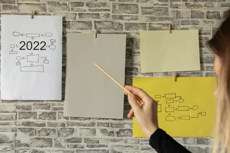 a girl stands near a wall with cards and drawings with geometric shapes, a business plan on a blackboard, planning, work and ideas
