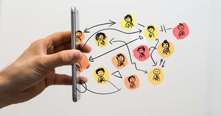 Trader investor broker holding finger using cell phone app executing financial stock trade market trading order to buy or sell