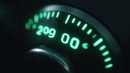 Digital display temperature gauge green light close up modern design technology measurement control panel precision automotive