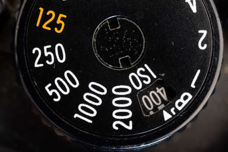 vintage objective lens macro with apertures scale, shallow DOF; focus on 5.6 number
