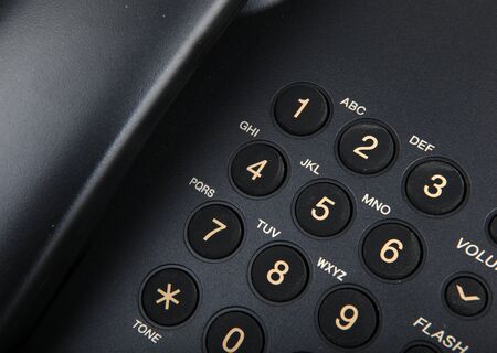 Horizontal top view close up of the keypad of a telephone with numbers showing