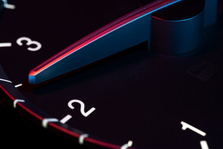 Soft focus on hour clockwise at half pass eleven o'clock before midnight of black and white classic clock.