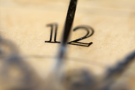 Detailed close-up of a vintage clock face, showing intricate design and aged texture. Hands point to Roman numeral IX, emphasizing timeless elegance and craftsmanship