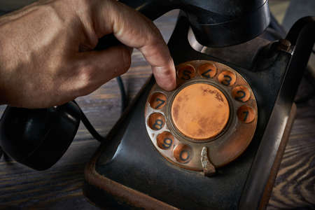 Hand dialing a number on a classic phone with round dial. vintage green telephone. copy space