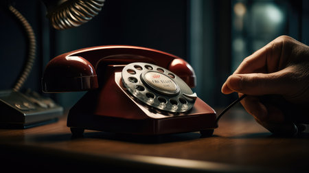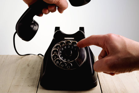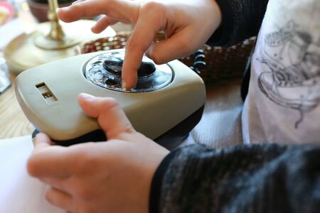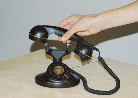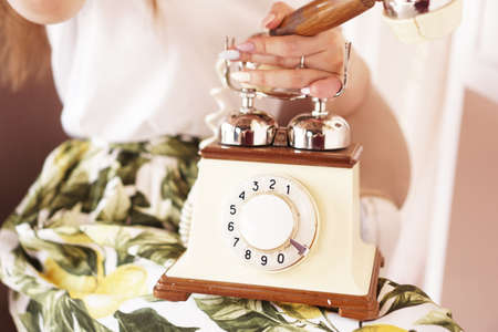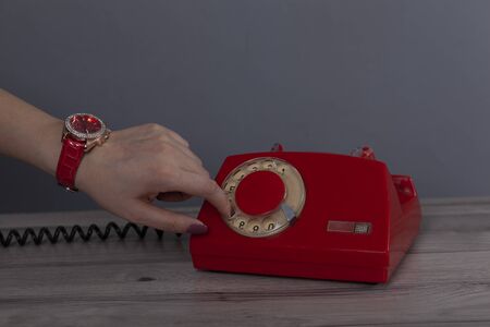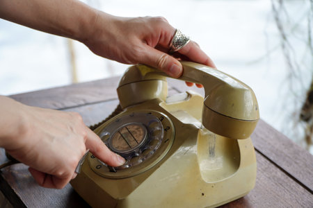 A elegant woman's hand picking up, putting down an old vintage 70's and 80's style rotary telephone receiver on a wooden background, retro office phone call concept