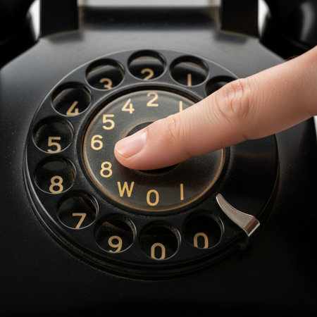 Low angle closeup view of a male finger dialing telephone number using black landline phone.