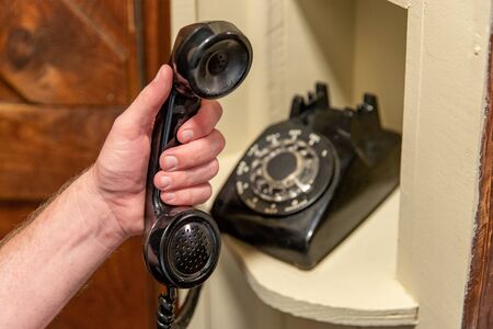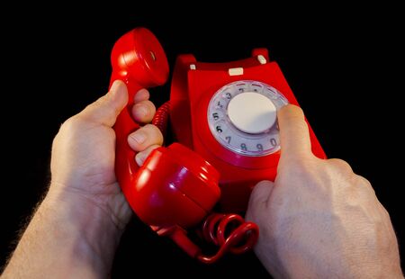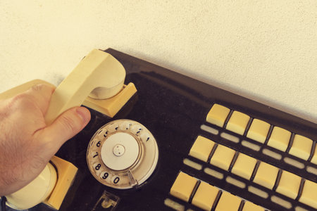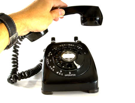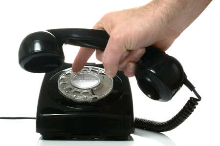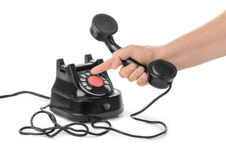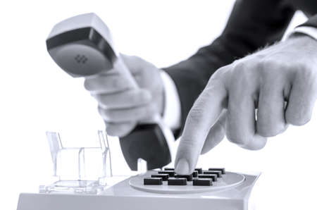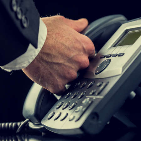Retro image of a businessman making a call on a landline telephone lifting the handset off the cradle of the instrument, closeup of the hand and keypad.