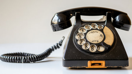 A black rotary telephone is displayed on a white surface, showcasing its circular dial and coiled cord. This timeless piece evokes nostalgia and reflects communication from the past