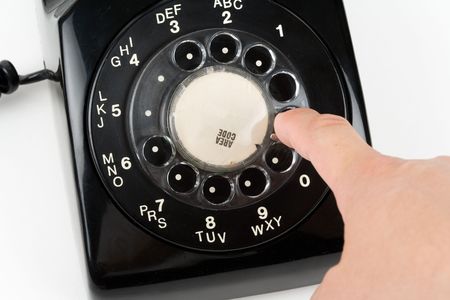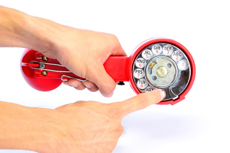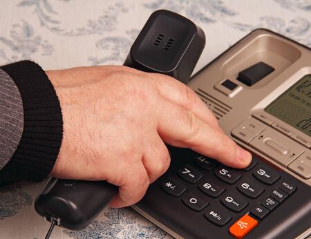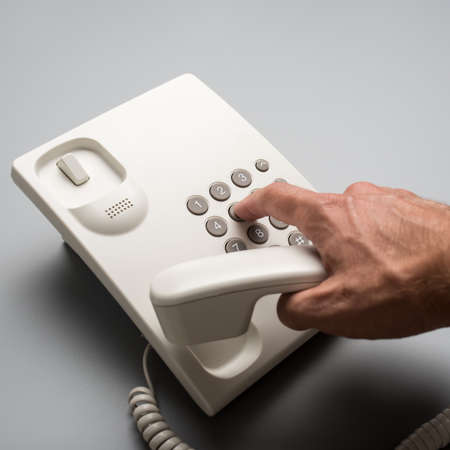 Closeup view of male finger dialing a telephone number using classical white landline phone.