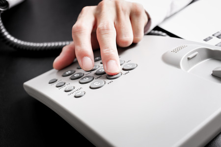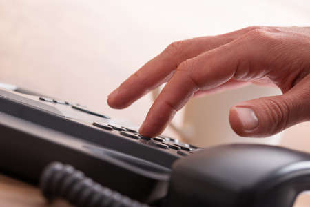 Closeup of male finger pressing a button on landline telephone keypad on a desk. Over dark blue background.