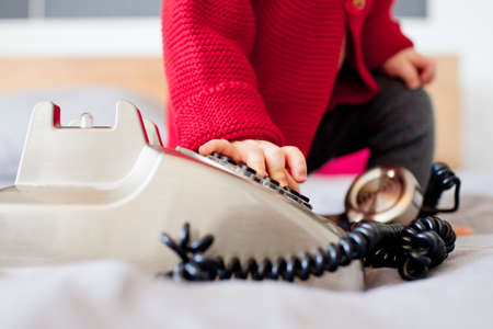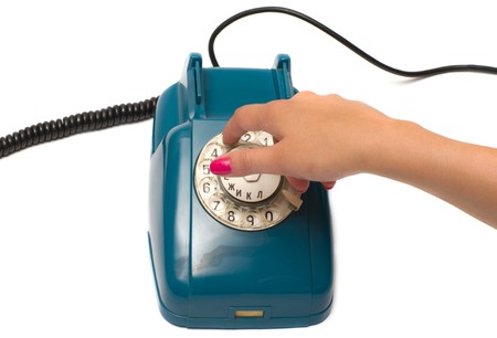 View from the above of female fingers dialing a telephone number on white landline classical phone.